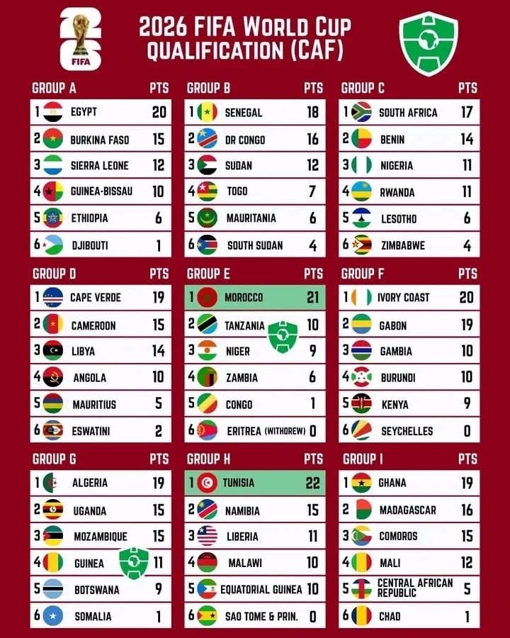 OFM:Fulbaana.10/2025-Gulaallii Waancaa Addunyaa 2026 Biyyoota Afrikaan Ramaddii 9tti qoodamuun dorgomamaa jiruun Gareen Biyyaalessa Morookoo fi Tuuniziyaan dursanii Afrikaarraa biyyoota hirmaannaa Waancaa Adduunyaa 2026 mirkaneeffataniidha.